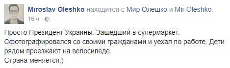 "Просто Президент Украины. Зашедший в супермаркет. Сфотографировался со своими гражданами и уехал по работе. Дети рядом проезжают на велосипеде. Страна меняется;)", - радостно сообщил Олешко в Facebook.