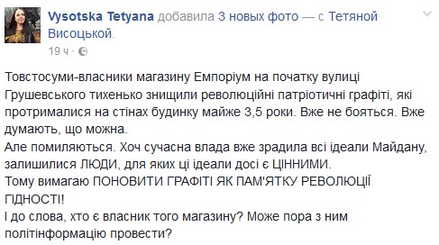 В Киеве с фасада магазина люкс-мебели "Эмпориум" на улице Грушевского, 4 исчезли знаменитые патриотические граффити, которые были нанесены во время Революции достоинства. Об этом сообщает журналист Татьяна Высоцкая на своей странице в Facebook.