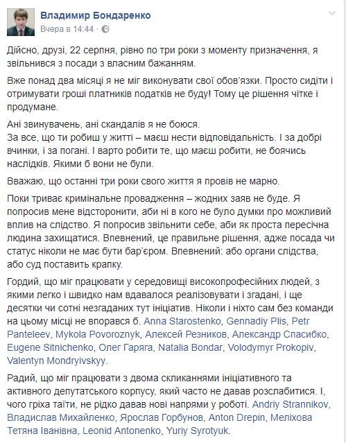 "22 августа, ровно через года с момента назначения, я уволился с собственным желанием. Уже более двух месяцев я не мог выполнять свои обязанности. Просто сидеть и получать деньги налогоплательщиков не буду! Поэтому это решение четкое и продуманное", - написал Бондаренко.