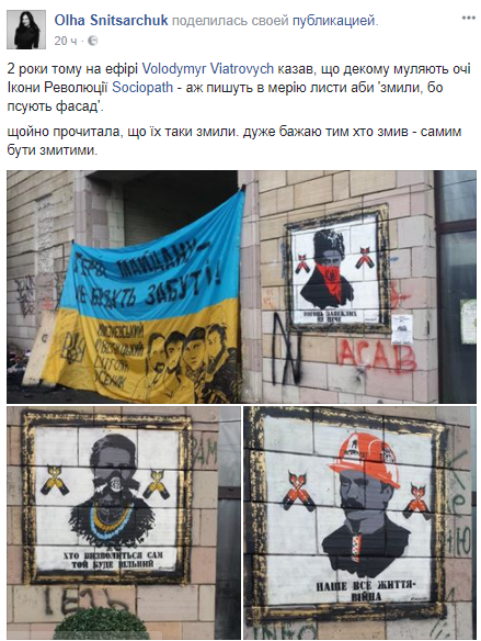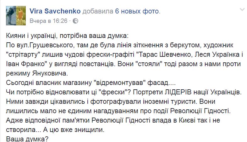 "Сейчас, 15:00, С14 идем в гости. В цивилизованных странах такие настенные памятники иногда приобретают исключительный вес, как напоминание об исторических событиях. Их охраняют законом. В нашем случае бутик с дорогой меблятиною решил, что дутая респектабельность ценнее памяти о триумфе гражданского духа. Рисунки стерли. Зря. Вернем утраченное. Приходите на Грушевского сейчас!", - написал активист.