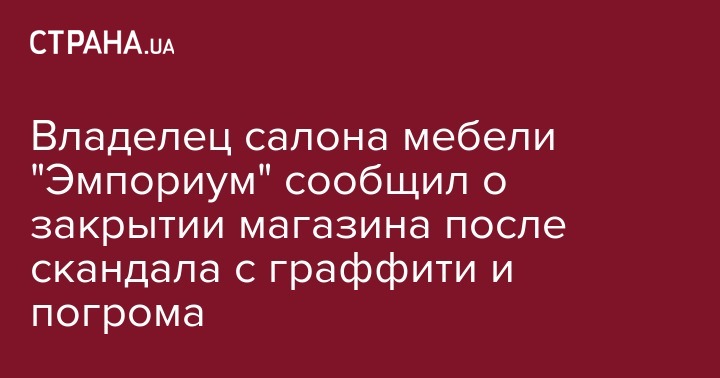 Владелец салона мебели "Эмпориум" по улице Грушевского в Киеве Игорь Доценко сообщил о закрытии магазина после череды событий, связанных с исчезновением с фасада памятных граффити времен Майдана и погрома с сожжением шин и разбитием витрин радикальными организациями. О решении закрыть магазин владелец сообщил на своей странице в Facebook.