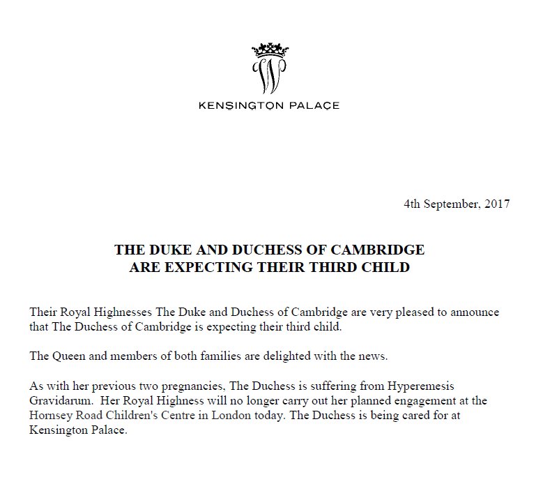 "Герцог и герцогиня Кембриджские очень рады сообщить, что Герцогиня Кембриджская ждет своего третьего ребенка", - сказано в сообщении.