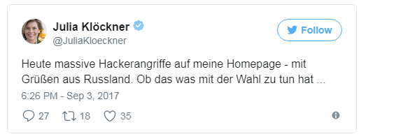 Лидер правящей немецкой политсилы "Христианско-демократический союз" (ХДС) Джулия Клокнер обвинила Россию в хакерской атаке на ее личный сайт. Об этом Клокнер написала в Twitter.