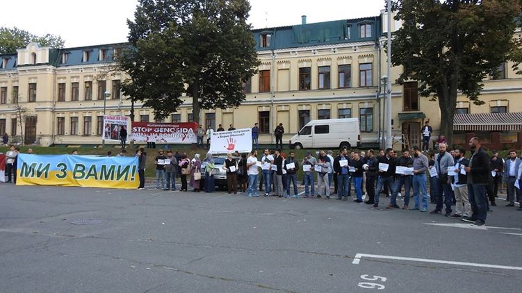 Вечером около 19:00 в Киеве под зданием МИД Украины началась акция в поддержку мусульман Мьянмы, которые вступили в столкновения с правительственными войсками