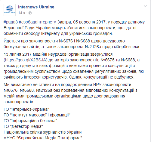 Еще 13 июля этого года медийные неправительственные организации обращались к авторам этих законопроектов, а также к депутатским фракциям с требованиями провести консультации с гражданским обществом по одобрению регулирующих законов, затрагивающих интересы пользователей. Однако, консультации так и не состоялись.