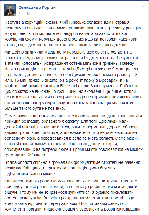 "Наступление на коррупционные схемы, которое Киевская областная администрация развернула совместно с силовыми органами, вызвало агрессивную реакцию коррупционеров, которые бросают все ресурсы на то, чтобы защитить свои коррупционные схемы. Коррупция довела область до катастрофы: ужасное состояние дорог, отсутствие достойных больниц, школ и детских садов", - говорит Горган.