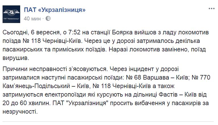 "6 сентября, в 7:52, на станции Боярка вышел из строя локомотив поезда № 118 Черновцы-Киев. Из-за этого в пути задержалось несколько пассажирских и пригородных поездов. Сейчас локомотив заменен, поезд отправился", – говорится в сообщении.