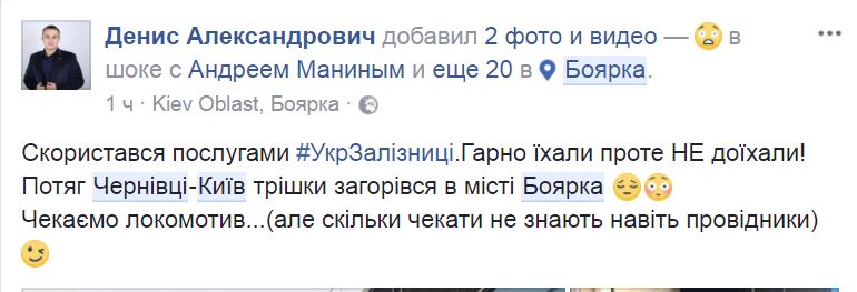 Так, один из пассажиров поезда Денис Александрович написал: "Воспользовался услугами # УкрЗализници. Хорошо ехали однако НЕ доехали! Поезд Черновцы-Киев немного загорелся в городе Боярка