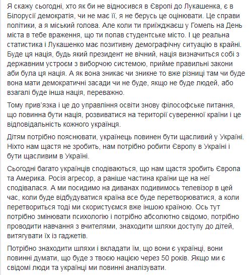 Он отметил, что кто как бы ни относился в Европе к Лукашенко, но "когда ты приезжаешь в Гомель на День города у тебя впечатление, что ты попал в студенческий город". "И это реальная статистика, и Лукашенко имеет положительную демографическую ситуацию в стране. Будет эта нация, любой президент не вечен, нация определится с государственным устройством, с избирательной системой, примет правильные законы, лишь бы была эта нация. А если она исчезает или исчезнет, то уже нет разницы будет ли она иметь демократические принципы или не будет, если не будет людей, или вообще будет другая нация. Поэтому привязка и это к управлению образования снова философский вопрос, что должна быть нация, развиваться на территории суверенной страны и это ответственность каждого украинца", - добавил Атрошенко.