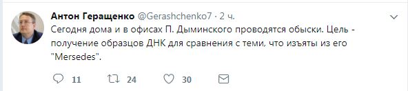 "Сегодня дома и в офисах Дыминского проводятся обыски. Цель - получение образцов ДНК для сравнения с теми, что изъяты из его Mersedes", - написал Геращенко.