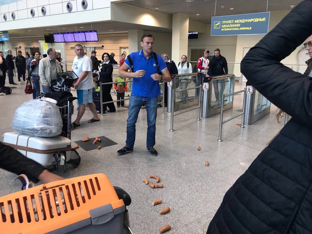 Российского оппозиционного политика Алексея Навального встречали в московском аэропорту "Домодедово" недоброжелатели со связкой сарделек из супермаркета. Об этом он сообщил на своей странице в Facebook.