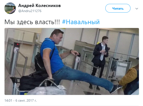 Судя по появившимся в соцсетях фотографиям, одного из молодых людей, повесивших сардельки, Навальный попытался пнуть ногой.