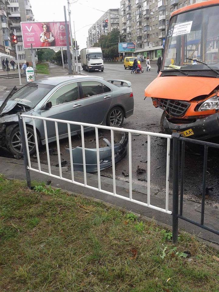 В среду, 6 сентября, Во Львове на перекрестке улиц Любинская и Петлюры, возле заправки ОККО, произошло ДТП с участием маршрутки №33 и автомобиля Honda Accord, в результате которой пострадали шесть пассажиров маршрутки.