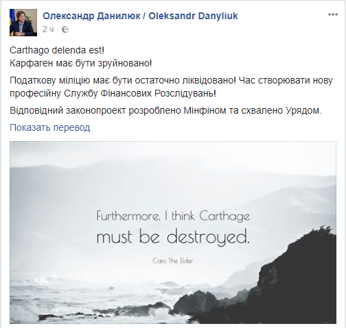 Сообщение он сопроводил красивой картинкой и латинской пословицей "Carthago delenda est!", что переводится как "вещи, которые нужно уничтожить".
