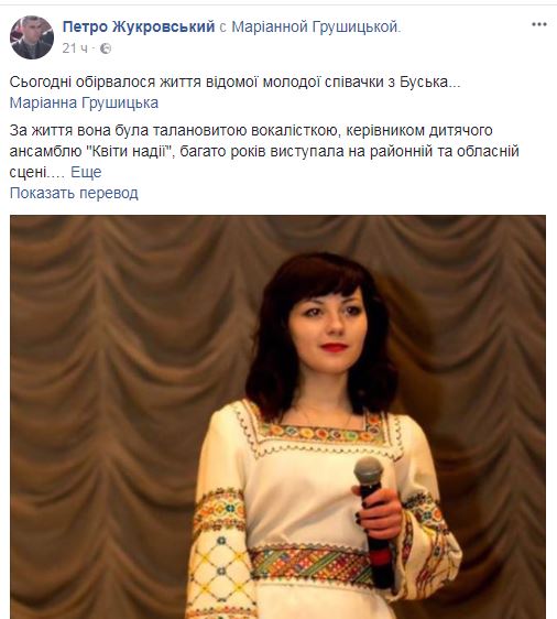 Не остался в стороне от трагедии и депутат Львовского областного совета Петр Жуковский: "Оборвалась жизнь молодой певицы Марианны Грушицкой. При жизни она была талантливой вокалисткой, руководителем детского ансамбля "Цветы надежды", много лет выступала на районной и областной сцене. В последнее время проводила в родном городе много патриотических и благотворительных мероприятий как, например, "Вечер памяти Кузьмы Скрябина", благотворительный вечер "Открой сердце" в поддержку пострадавших от войны на Востоке Украины семей, фестиваль народного творчества", - сообщает он на своей странице в Facebook.
