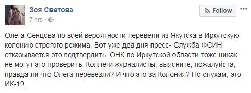 "Олега Сенцова по всей вероятности перевели из Якутска в Иркутскую колонию строгого режима. Вот уже два дня пресс-служба ФСИН отказывается это подтвердить", - написала она.