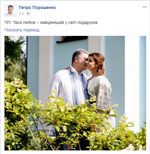"Твоя любовь - самый ценный в мире подарок", - написал Порошенко, обращаясь к супруге.