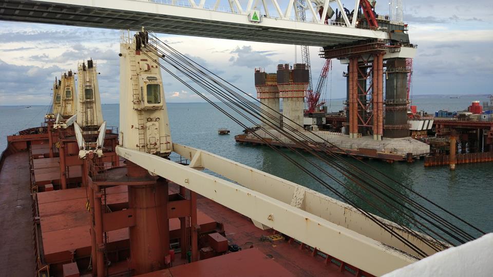 Под Керченским мостом, который Россия строит в Крым, прошло первое судно, которое обслуживалось в Мариупольском порту. Об этом говориться на странице порта в Facebook.