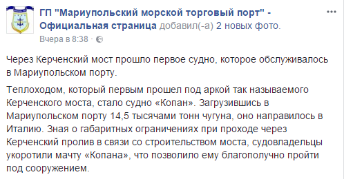 "Теплоходом, который первым прошел под аркой так называемого Керченского моста, стало судно "Копан". Загрузившись в Мариупольском порту 14,5 тысячами тонн чугуна, оно направилось в Италию. Зная о габаритных ограничениях при проходе через Керченский пролив в связи со строительством моста, судовладельцы укоротили мачту "Копана", что позволило ему благополучно пройти под сооружением", - говорится в сообщении.