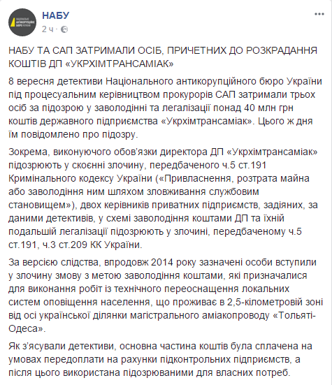 "8 сентября детективы НАБУ под процессуальным руководством прокуроров Специализированной антикоррупционной прокуратуры (САП) задержали 3 человек по подозрению в завладении и легализации более 40 млн гривен средств государственного предприятия "Укрхимтрансаммиак". Им сообщено о подозрении", - уточнили в НАБУ.