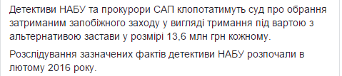 Детективы НАБУ и прокуроры САП намерены ходатайствовать об избрании задержанным меры пресечения в виде содержания под стражей с альтернативой залога в размере 13,6 млн гривен каждому. Отмечается, что расследование указанных фактов детективы НАБУ начали в феврале 2016 года.