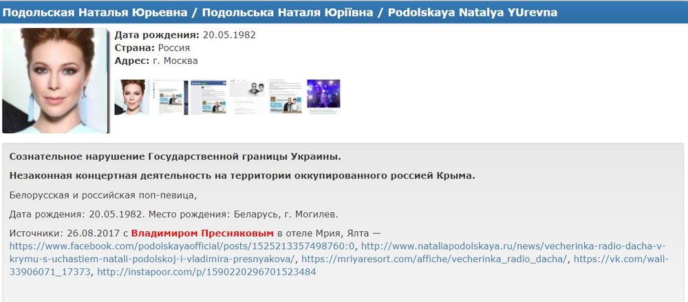 Российская певица Наталья Подольская добавлена в базу данных сайта "Миротворец". Об этом сообщается на сайте организации