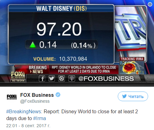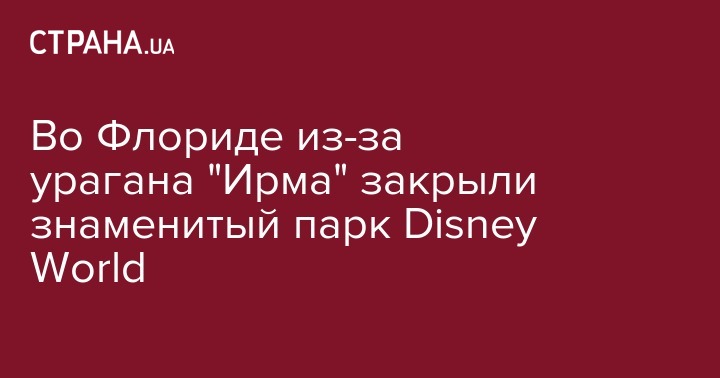Крупнейший центр развлечений в мире "Диснейуорлд" (Disney World), в американском штате Флорида, закрывают по меньшей мере на два дня в связи с приближающимся ураганом "Ирма". Об этом сообщает Fox Business в twitter.