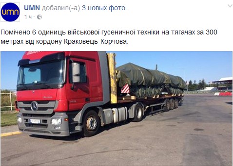 "Замечено 6 единиц военной гусеничной техники на тягачах в 300 метрах от границы Краковец-Корчева", - говорится в сообщении.