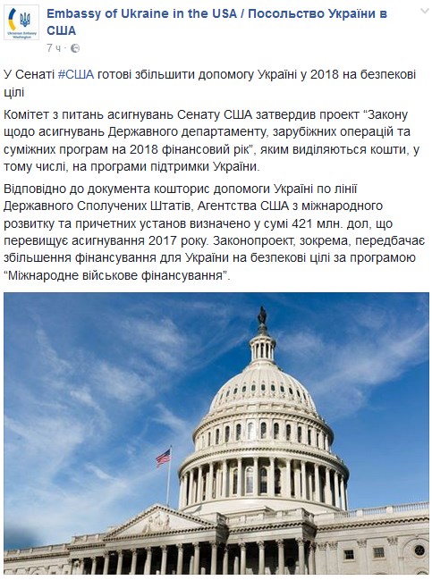 "Комитет по вопросам ассигнований Сената США утвердил проект "Закона об ассигнованиях Государственного департамента, зарубежных операций и смежных программ на 2018 финансовый год", которым выделяются средства, в том числе, на программы поддержки Украины. Согласно документу смета помощи Украине по линии Государственного агентства США по международному развитию и причастных учреждений определена в сумме $421 млн, что превышает ассигнования 2017 года", - говорится в сообщении.