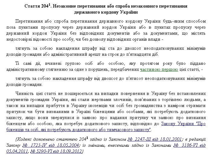 Согласно данной статье, незаконным пересечением государственной границы Украины или попыткой такого пересечения считается одно из следующих действий: