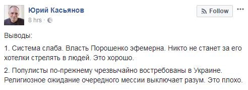 "Выводы: 1. Система слаба. Власть Порошенко эфемерна. Никто не станет за его хотелки стрелять в людей. Это хорошо. 2. Популисты по-прежнему чрезвычайно востребованы в Украине. Религиозное ожидание очередного мессии выключает разум. Это плохо", – написал он.