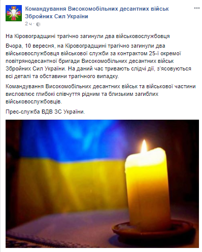 "Вчера, 10 сентября, на Кировоградщине трагически погибли два военнослужащих военной службы по контракту 25-й отдельной воздушно-десантной бригады высокомобильных десантных войск Вооруженных Сил Украины. В настоящее время проводятся следственные действия, выясняются все детали и обстоятельства трагического случая", – говорится в сообщении.