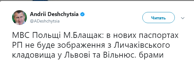"Министр внутренних дел Польши Мариуш Блащак: в новых паспортах Польши не будет изображений Лычаковского кладбища во Львове и Вильнюсских ворот", - написал Дещица.