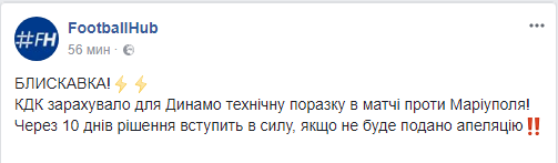 Контрольно-дисциплинарный комитет Федерации футбола Украины принял решение засчитать киевскому "Динамо" техническое поражение 0:3 за неявку на матч против "Мариуполя" в прифронтовой город из-за отсутствия гарантий безопасности. Об этом сообщает FootballHub в Facebook.