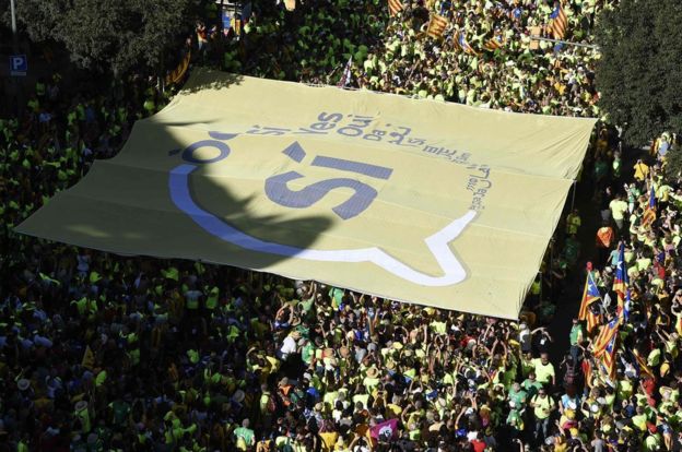 В Барселоне несколько сотен тысяч каталонцев (по другим данным миллион) вышли на демонстрацию на улицы города в знак поддержки референдума о независимости этого региона от Испании, передает BBC.