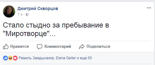 "Стало стыдно за пребывание в "Миротворце"...", - пишет на своей странице в Facebook блогер Дмитрий Скворцов, который уже давно присутствует на "Миротворце".