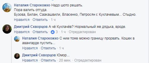 "Надо шото решать. Пора валить оттуда. Бузова, Билан, Саакашвили, Власенко, Петросян с Куклачевым... Стыдно", - пишет другой старожил "Миротворца" Наталья Старокожко. А на вопрос, чем ей не угодил Куклачев она отвечает: "С ним тоже можно границу прорвать. Кошек в авангарде пустить...".