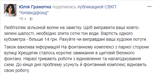 "Любителям зеленой волны на заметку. Чтобы исправить ваши желто-зеленые шалости, необходимо слить сотни тонн воды. Стоимость одного кубометра - более 14 грн. Считайте, оправданы ваши художественные потуги", - пишет пресс-секретарь заместителя председателя КГГА Петра Пантелеева Юлия Грамотная.