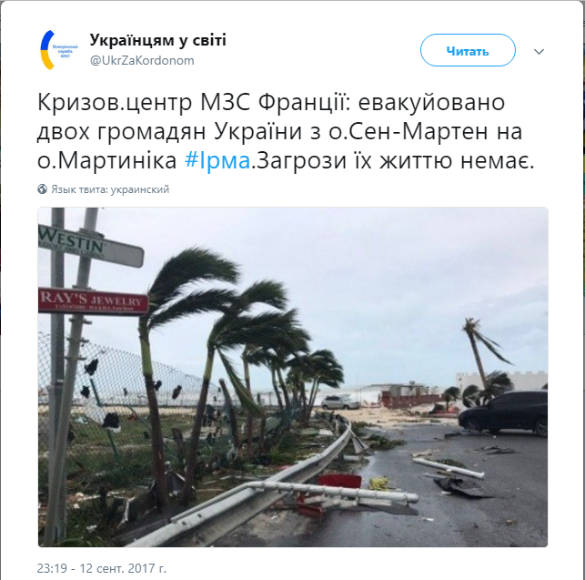 "Эвакуированы двое граждан Украины с острова Сен-Мартен и острова Мартиника. Угрозы их жизни нет", - отметили в МИДе.