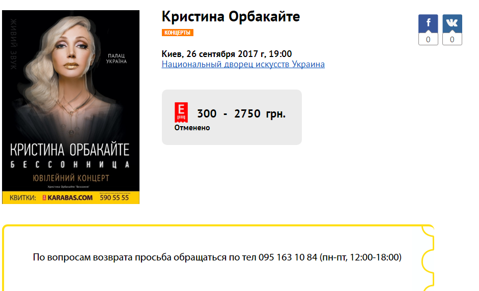 При этом билеты на концерт в Киеве продавали за 300-2750 гривен. Людям вернут деньги, номера указаны на сайте.