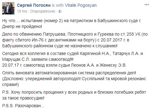 В Днепре судьи Бабушкинского райсуда взяли самоотвод в деле относительно заочного осуждения главарей "ЛНР", которых обвиняют в гибели 49 военных ВСУ на борту сбитого боевиками самолета ИЛ-76 в Луганске Об этом сообщил адвокат Сергей Погосян в Facebook.