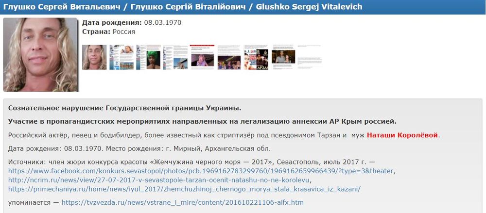 По данным центра, актер и стриптизер Глушко (псевдоним "Тарзан" обвиняется в сознательном нарушении Государственной границы Украины. Также ему инкриминируют участие в пропагандистских мероприятиях, направленных на легализацию аннексии Крыма.