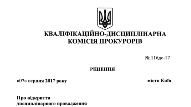 Квалификационно-дисциплинарная комиссия прокуроров начала против Генерального прокурора Юрия Луценко дисциплинарное производство. Об этом свидетельствует решение члена Квалификационно-дисциплинарной комиссии прокуроров Анатолия Коваленко, датированное 7 августа 2017, пишет "Украинская правда".