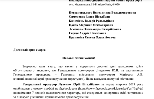 В дисциплинарной жалобе отмечается, что генеральный прокурор Луценко за первое полугодие 2017 года опубликовал в своем профиле "минимум 7 сообщений недвусмысленного характера, которые касаются конкретных лиц, задержанных по подозрению в совершении уголовного правонарушения".