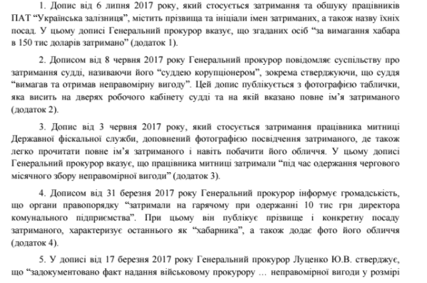 Так, в сообщении генпрокурора от 6 июля 2017 года, которые касается задержания и обыска сотрудников ПАО "Украинская железная дорога", содержатся фамилии и инициалы имен задержанных, а также название их должностей. В этом сообщении Генеральный прокурор указывает, что упомянутые лица "за вымогательство взятки в 150 тыс. долларов задержаны".