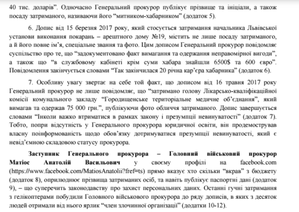 Также в дисциплинарной жалобе упоминаются посты Луценко от 31 марта 2017 года о взяточнике из коммунального предприятия (генпрокурор публикует фамилию и конкретную должность задержанного, характеризует последнего как "взяточника", а также добавляет фото), от 17 марта 2017 года по взятке военному прокурору (Луценко пишет фамилию и инициалы, а также должность задержанного, называя его "таможенником-взяточником").