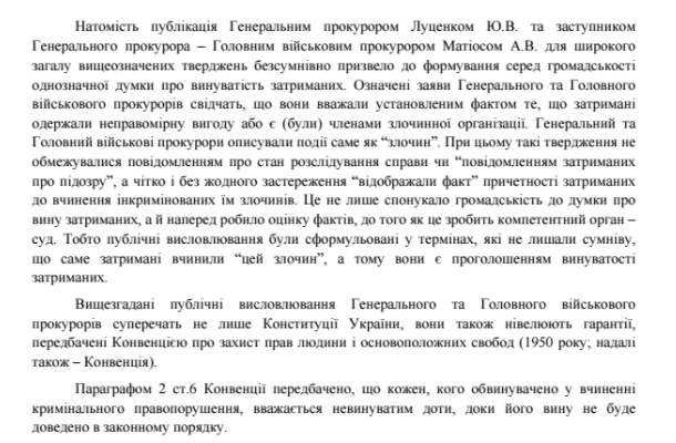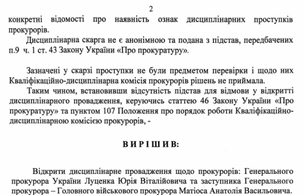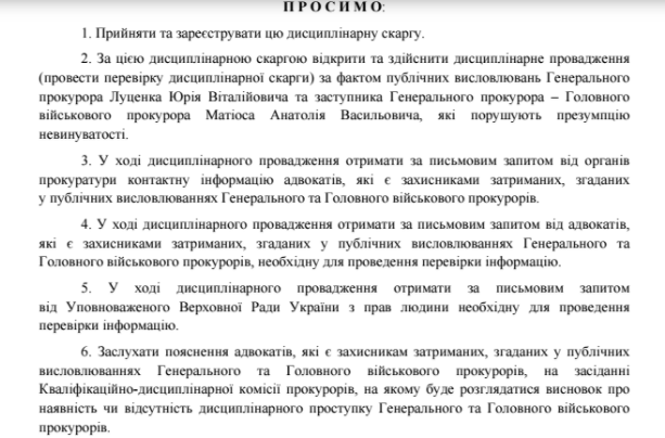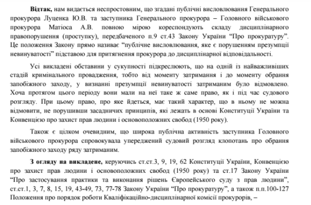 Согласно самой дисциплинарной жалобе, Луценко и Матиосу вменяются в вину публикация в социальных сетях сообщений, нарушающих презумпцию невиновности. В соответствии с Законом Украины "О прокуратуре" публичное высказывание, которое является нарушением презумпции невиновности, является основанием для привлечения прокурора к дисциплинарной ответственности.