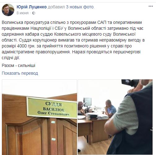 И, наконец, прокуроры отмечают, что в заметке от 16 мая 2017 года Генеральный прокурор не только сообщает, что взяточник из сферы медицины,  который требовал и получил 75 000 грн., но и публикует фото задержанного.