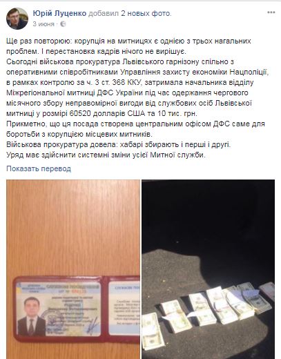 Под номером три - сообщение от 3 июня 2017 года, которое касается задержания сотрудника таможни Государственной фискальной службы. Оно дополнено фотографией удостоверения задержанного, где также легко прочитать полное имя и даже увидеть его лицо. В этом сообщении Генеральный прокурор указывает, что работника таможни задержали во время получения очередного месячного сбора неправомерной выгоды.