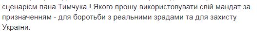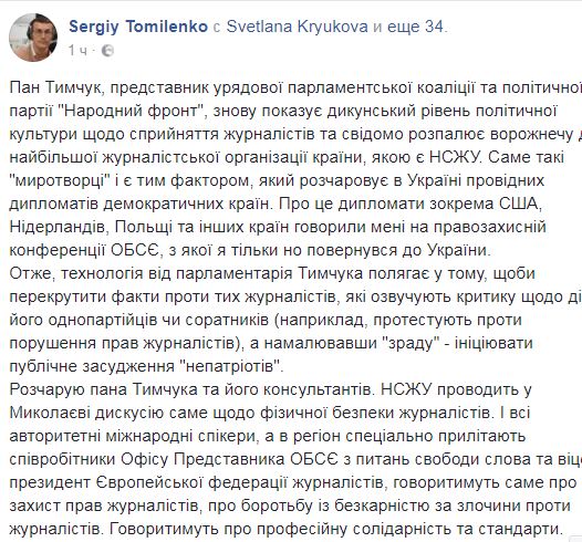 "Господин Тымчук, представитель правительственной парламентской коалиции и политической партии "Народный фронт", вновь показывает дикарский уровень политической культуры относительно восприятия журналистов и сознательно разжигает вражду к крупнейшей журналистской организации страны, которой является НСЖУ", - написал Томиленко.